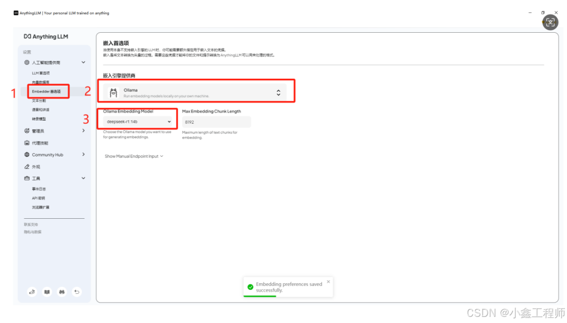 - ①点击【Embedder首选项】,②提供商选择【Ollama】,③点击【保存】