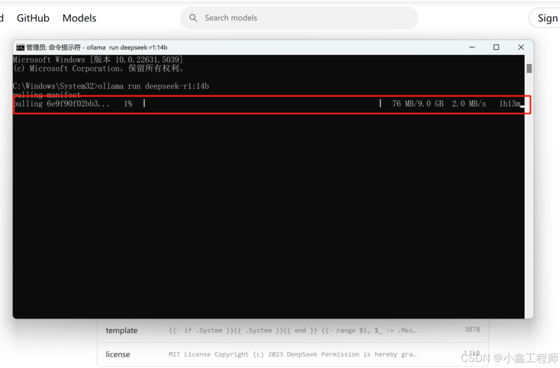 提示:若是要删除模型,输入命令ollama rm+模型名称,如ollama rm deepseek-r1:14b