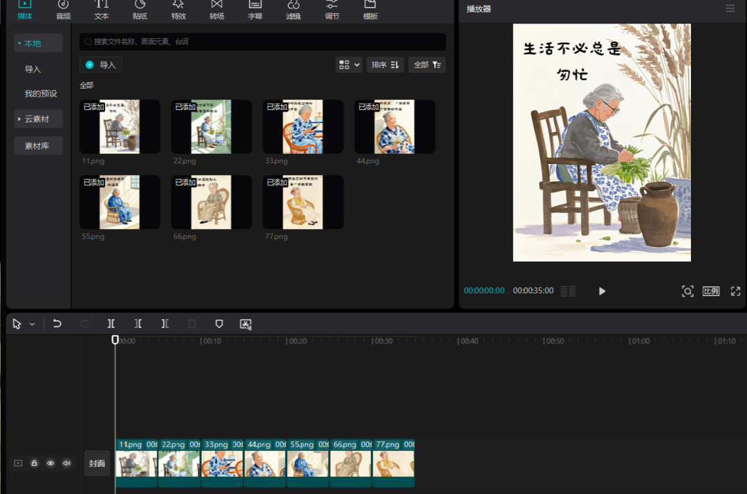 然后,将生成的图片导入进剪映,按照顺序排好