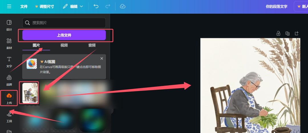 导入图片,上传文件,点击上传的图片,在画布中将图片拉满