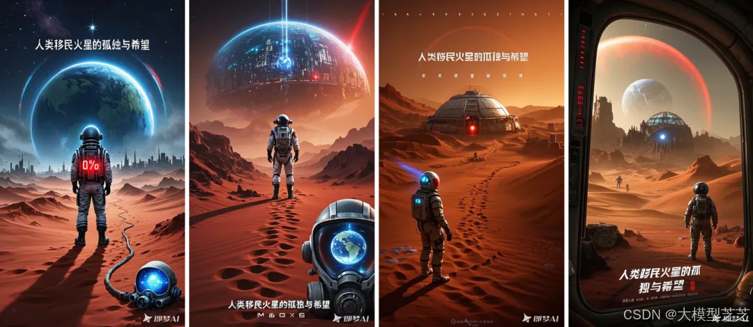 2.向****DeepSeek提问:(以企业高管访谈栏目为例)为开放式对话栏目生成科幻电影海报提示词,主题为‘人类移民火星的孤独与希望’,要求突出人物背影与荒芜星球对比。