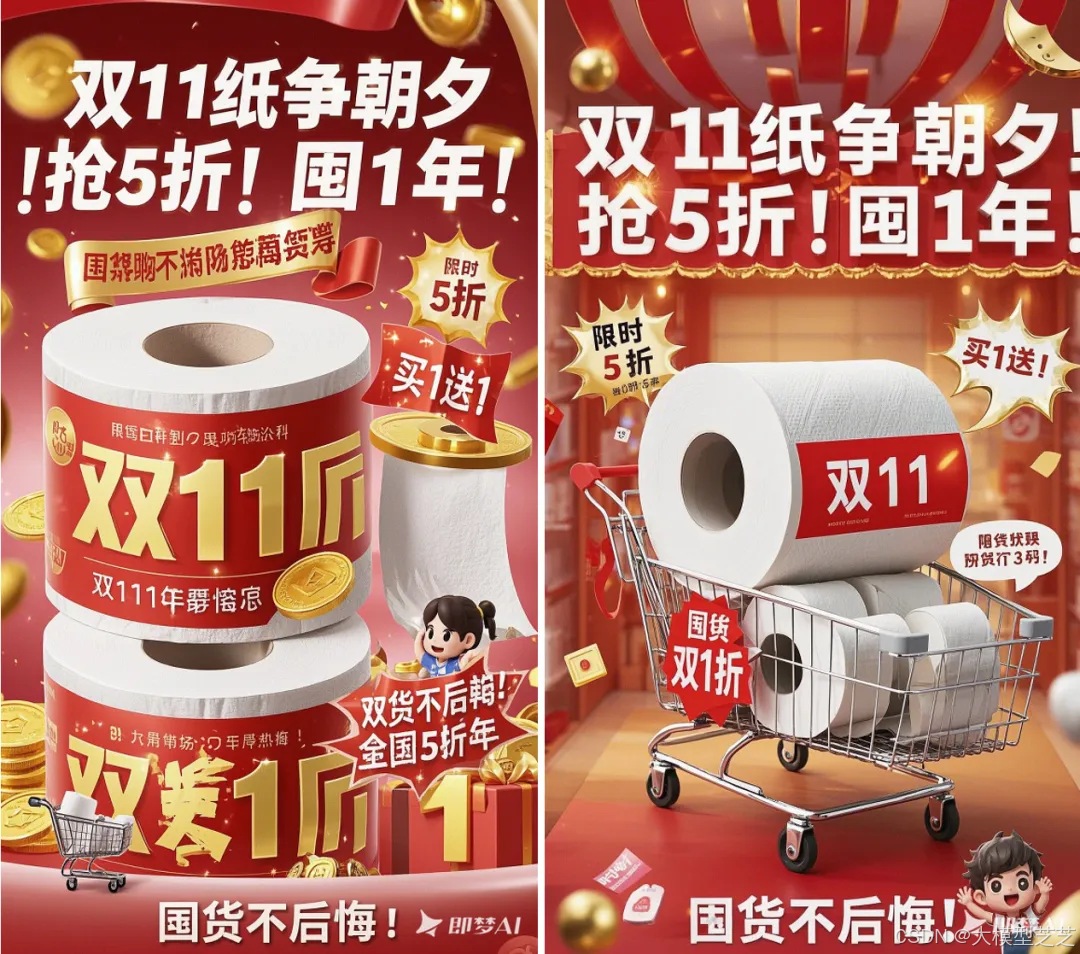 1.向DeepSeek提问:(以双11卫生纸促销为例)我是设计小白,想用AI绘图工具的文生图功能做一张双11卫生纸促销的营销海报,帮我设计一段提示词,符合大促期间的活动氛围,并搭配促销文案。