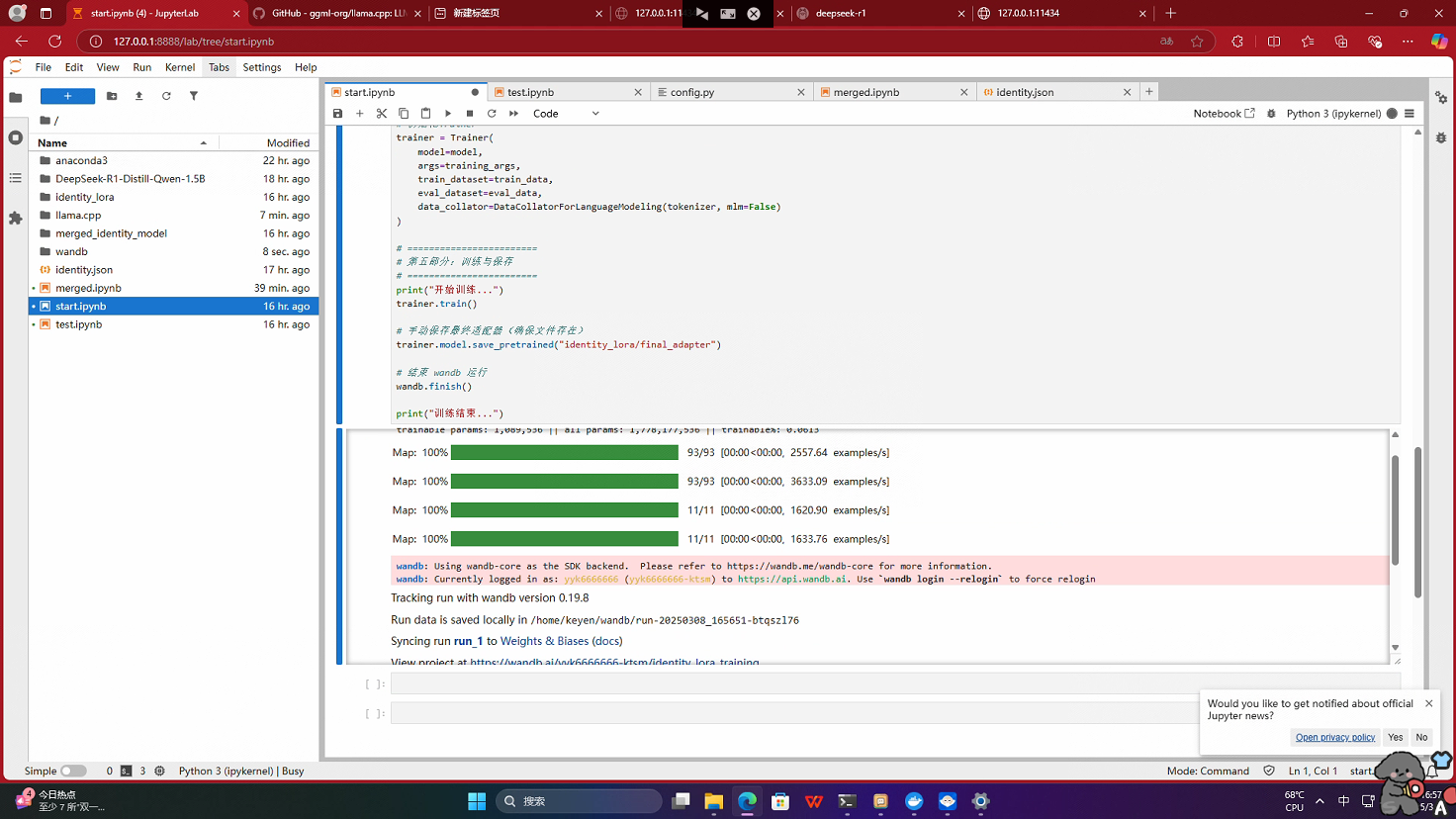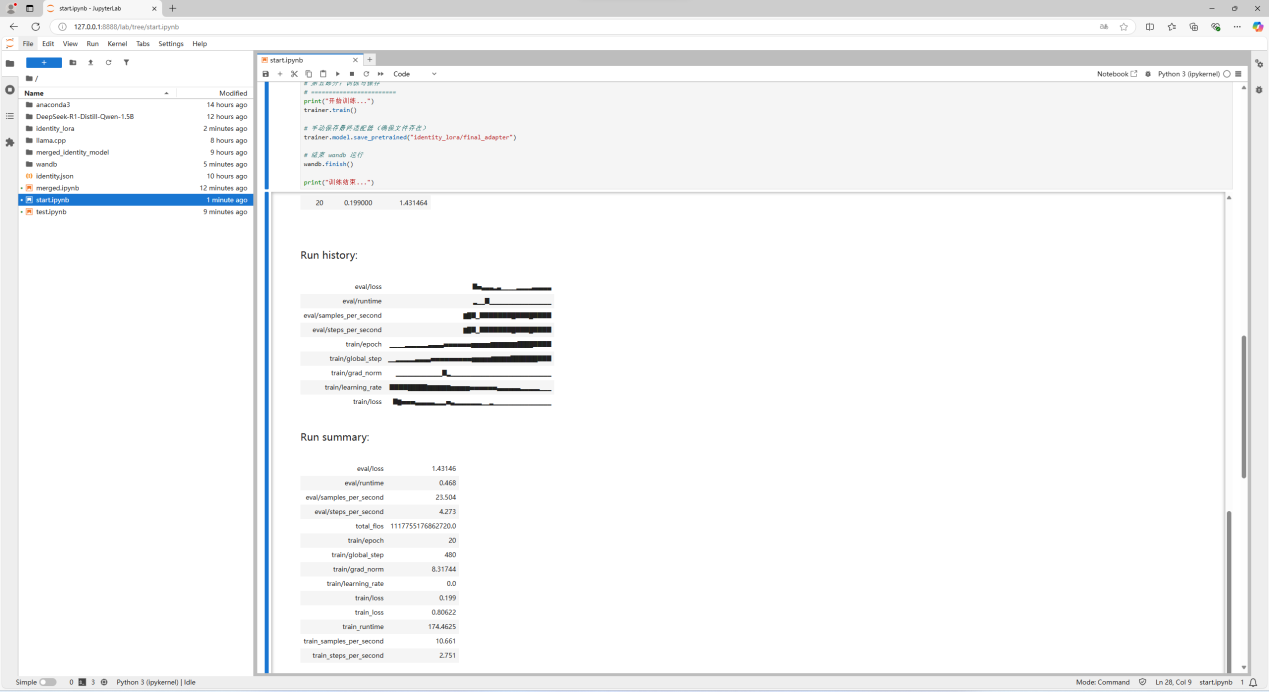 - 运行 start.ipynb 开始微调,得到identity_lora(训练检查点目录文件)