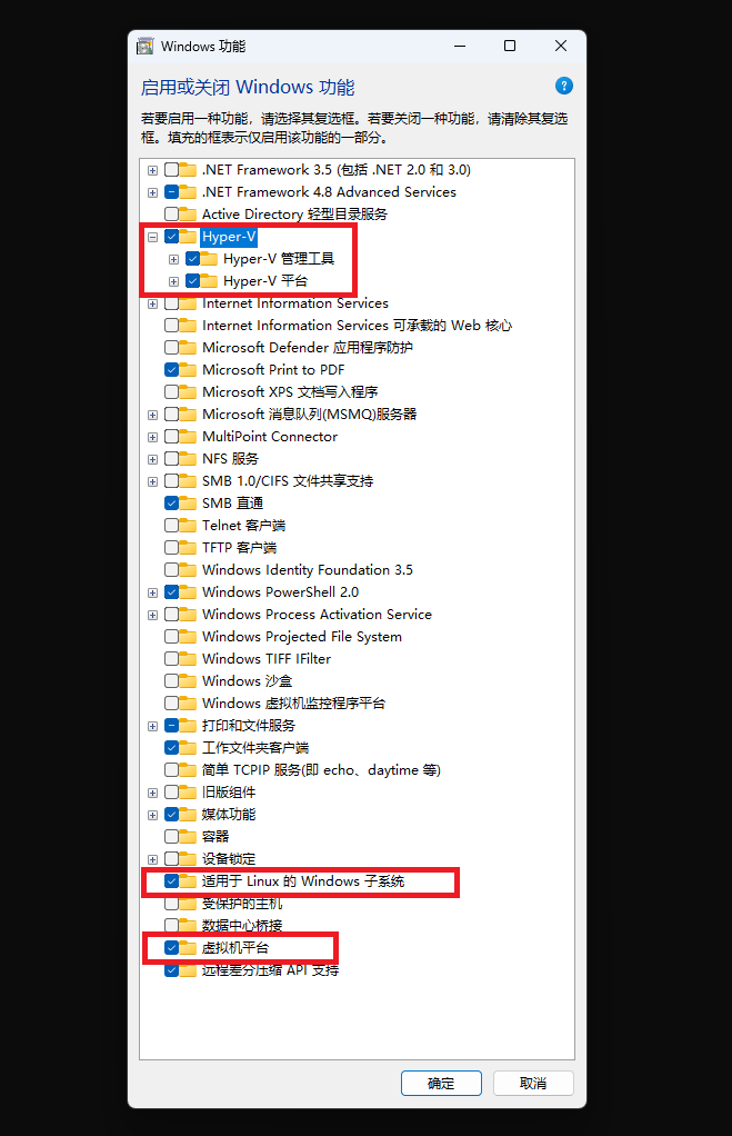 打开【控制面板】→【程序】→【启用或关闭 Windows 功能】。勾选虚拟机平台、适用于 Linux 的 Windows 子系统,(如有 Hyper-V,建议也勾选)。点击确定后,重启计算机。