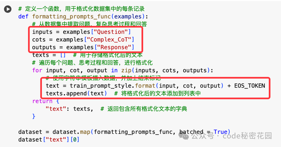 这段代码其实就是在定义一个用于格式化微调数据集的模版,其中的三个 “{}” 其实就是对应的我们要传入的三个变量,分别对应原始问题、思考过程、最终答案三个部分。