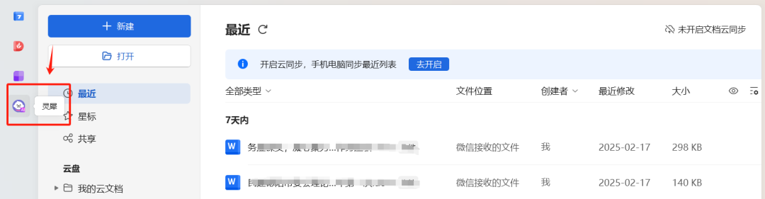 打开WPS主界面,在左侧栏中点击**「灵犀」**进入模型。⬇️
