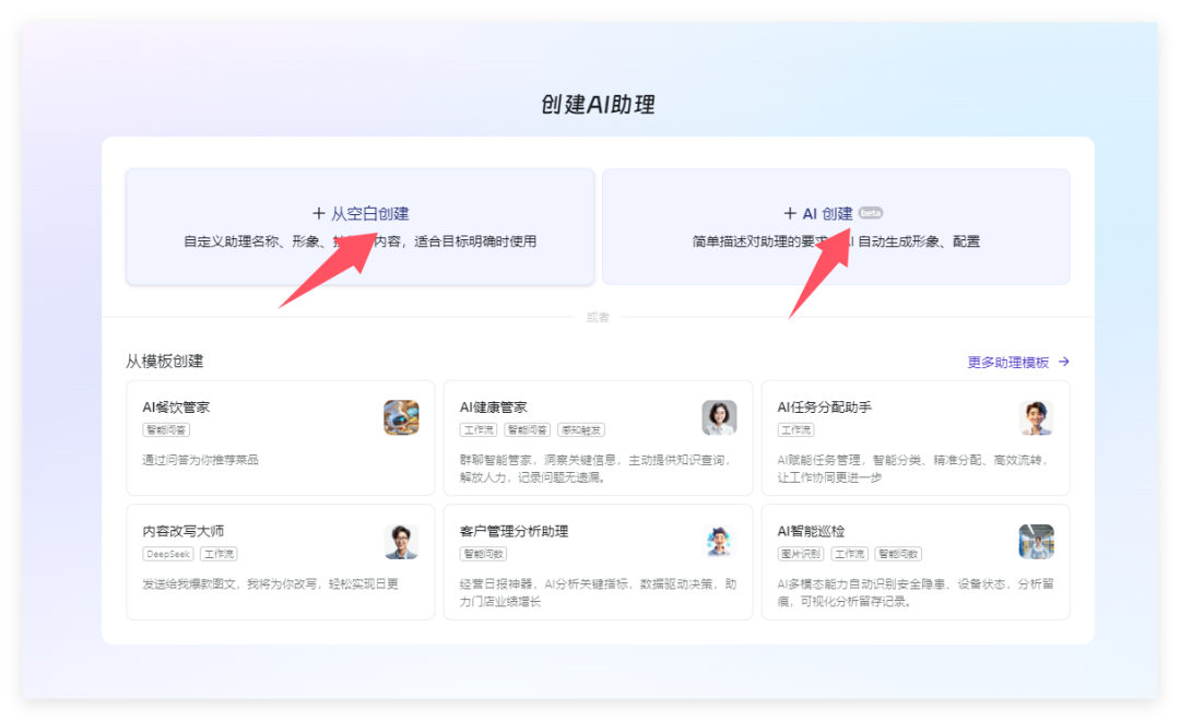 接下来点击从空白创建或者AI创建都行,从空白创建就是一步步填写你的助理形象,名称,技能等信息,比较适合目标明确的时候使用,如果你对业务或者对智能体的要求不清楚可以选择AI创建。