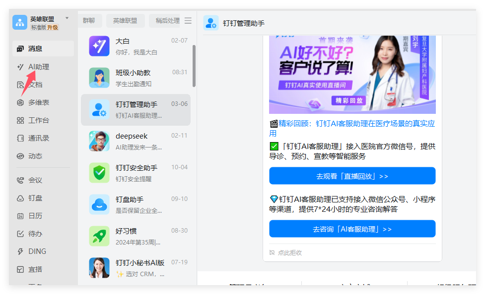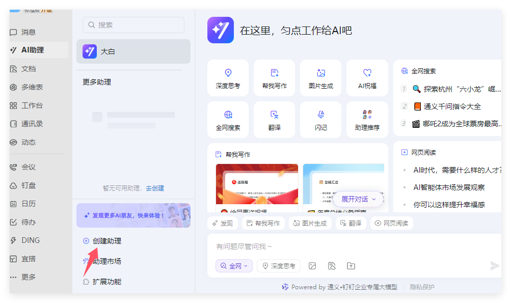 现在国内智能体平台很多,百度飞桨,腾讯混元,字节的扣子啥的很多,今天我选择的是钉钉,点击左侧AI助理,接下来点击创建助理。如果没有找到AI助理的可以去设置里看下你是不是关闭了。
