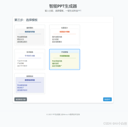 我想要做一个ppt生成器,我输入想要做的ppt主题,你帮我生成内容,和可选模板列表,我选择模板后就能生成ppt,我可以在线查看ppt的内容,也可以下载ppt到本地