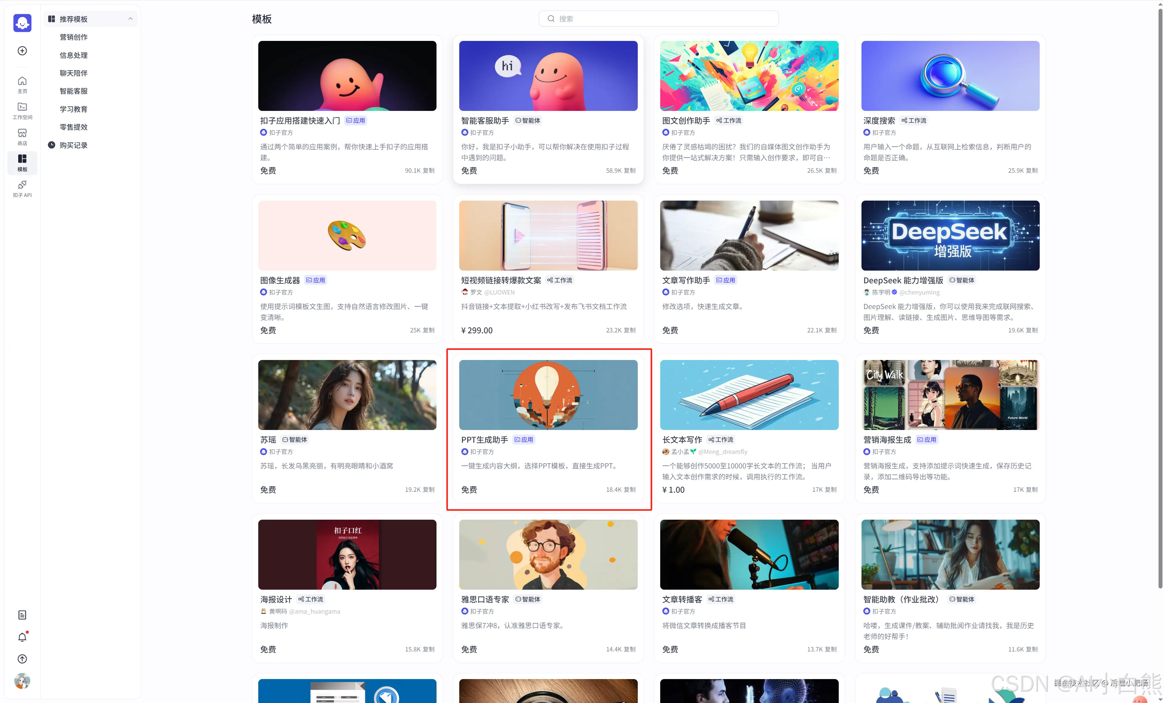 进入Coze官网(www.coze.cn/home),Coze已经有很多现成的模板,包含PPT生成器、海报设计、客服助手等。