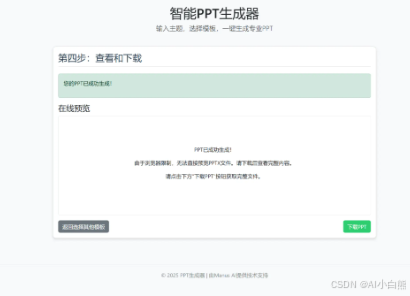 选择完主题后,点击上图的【生成PPT】,就能获取PPT了,这里有一个问题,他没有实现在线预览成品PPT的功能: