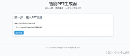 点击链接进去,确实是一个PPT生成器,我测试了一下,输入PPT主题(让它帮我写一个DeepSeek和Manus区别说明的PPT)以后点击了【生成内容】: