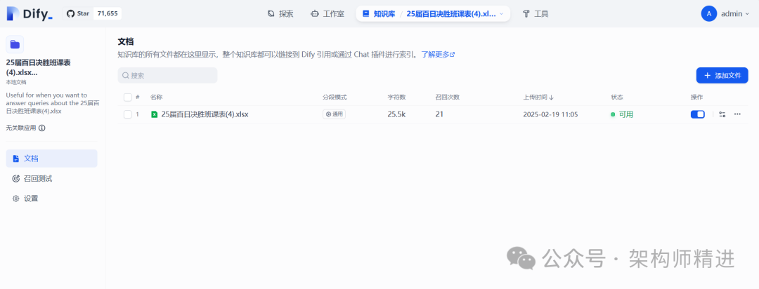 文件上传后,Dify 会自动对数据进行处理和索引,将这些知识转化为可以快速检索和利用的形式。