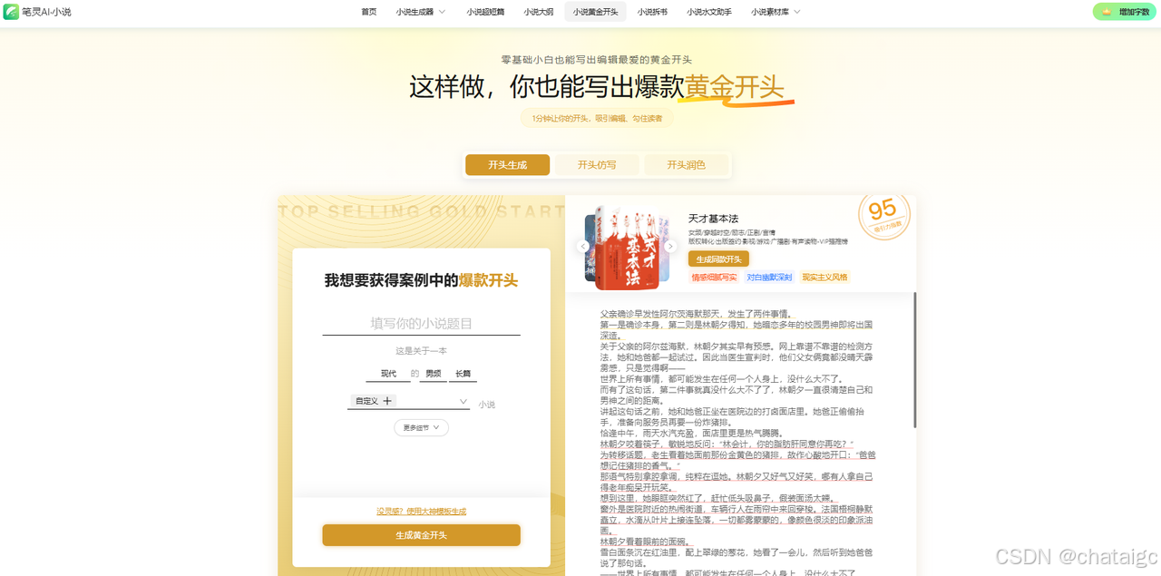 举个例子,以前写个开头得憋三天,现在用AI生成5个版本,10分钟搞定。再配上笔灵AI的“黄金开头”功能,连编辑都说“有内味儿”。这哪是写小说?简直是开外挂!现在我就来手把手教大家如何用AI写小说!