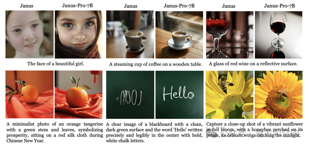 图2 | 比较Janus-Pro与其前身Janus的文本到图像生成效果。Janus-Pro在短提示下提供更稳定的输出,具有更高的视觉质量、更丰富的细节,以及生成简单文本的能力。图像分辨率为384x384。