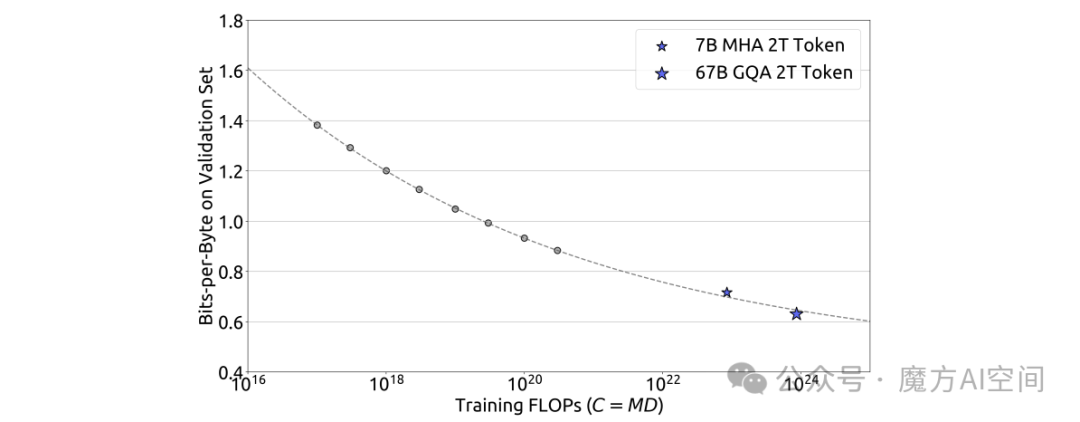 图5 | 性能缩放曲线。指标是验证集上的每秒比特数(bits-per-byte)。虚线代表拟合较小模型(灰色圆圈)的幂律。蓝色星号代表DeepSeek LLM 7B和67B。它们的性能被缩放曲线很好地预测了
