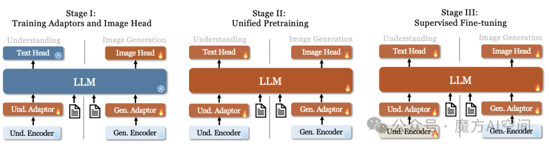 阶段II:统一预训练,使用多模态语料库进行预训练,使Janus能够学习多模态理解和生成。