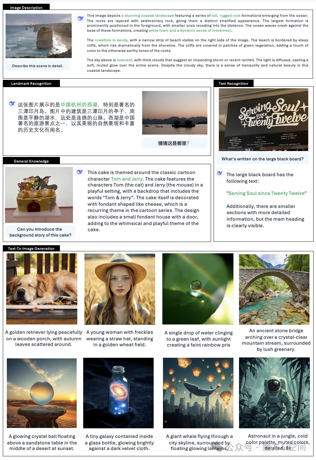DeepSeek-VL2在一般视觉问答、模因理解、多图像对话和视觉故事讲述等方面展示了其强大的能力。模型能够准确识别地标、理解图表、描述模因中的幽默,并生成连贯的故事。