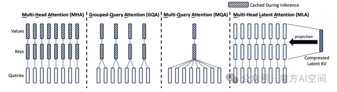 图3 | 多头注意力(MHA)、分组查询注意力(GQA)、多查询注意力(MQA)和多头潜在注意力(MLA)的简化示意图。通过将键和值联合压缩成一个潜在向量,MLA在推理过程中显著减少了KV缓存