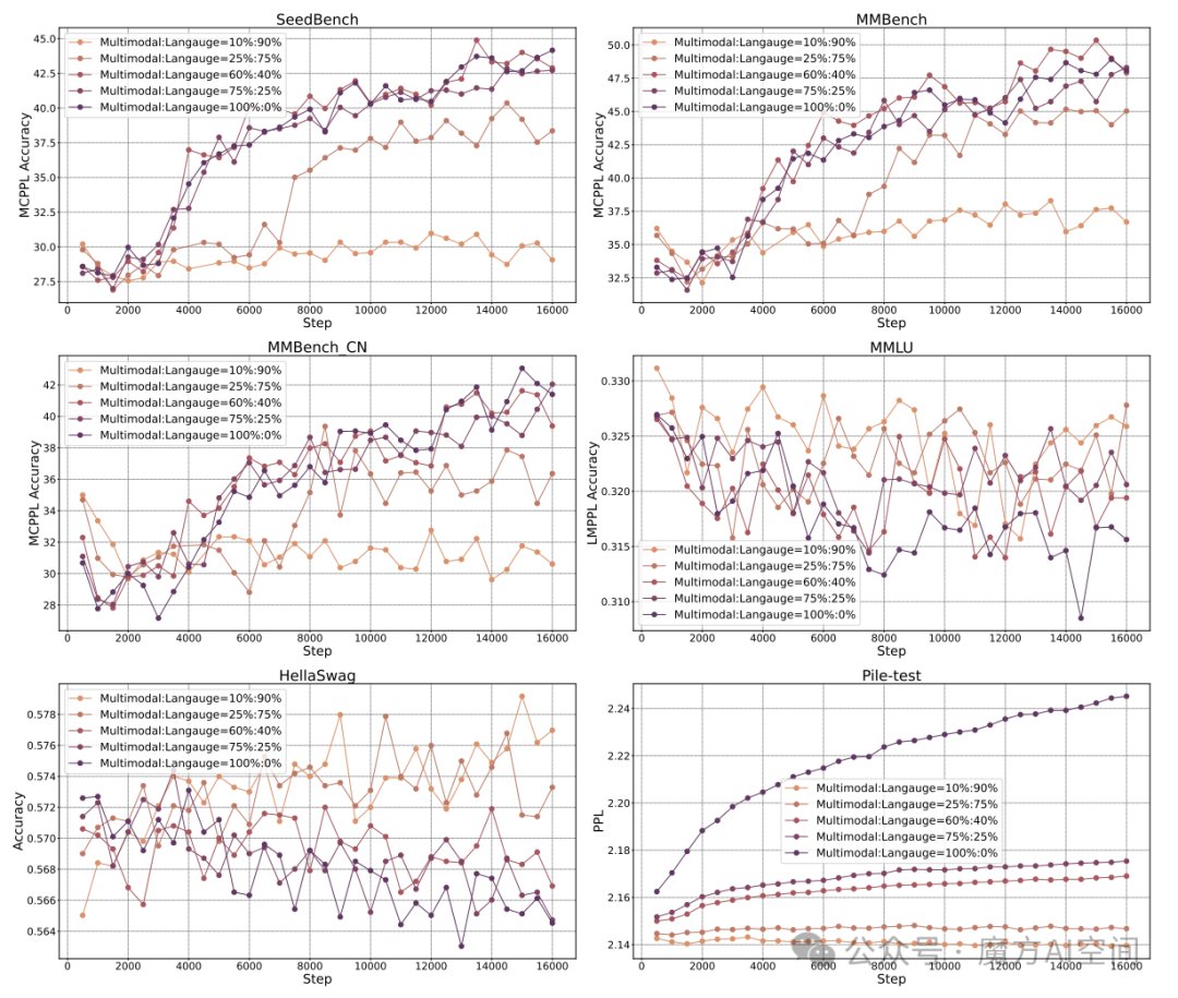 图4 | 在训练阶段2,不同多模态数据融合比例的比较性能结果。过多的多模态数据比例(多模态:语言=100%:0%)会导致大型语言模型显著遗忘语言能力。一个合适的比例(多模态:语言=70%:30%)可以有效地减轻语言遗忘的问题,同时增强模型的多模态能力。
