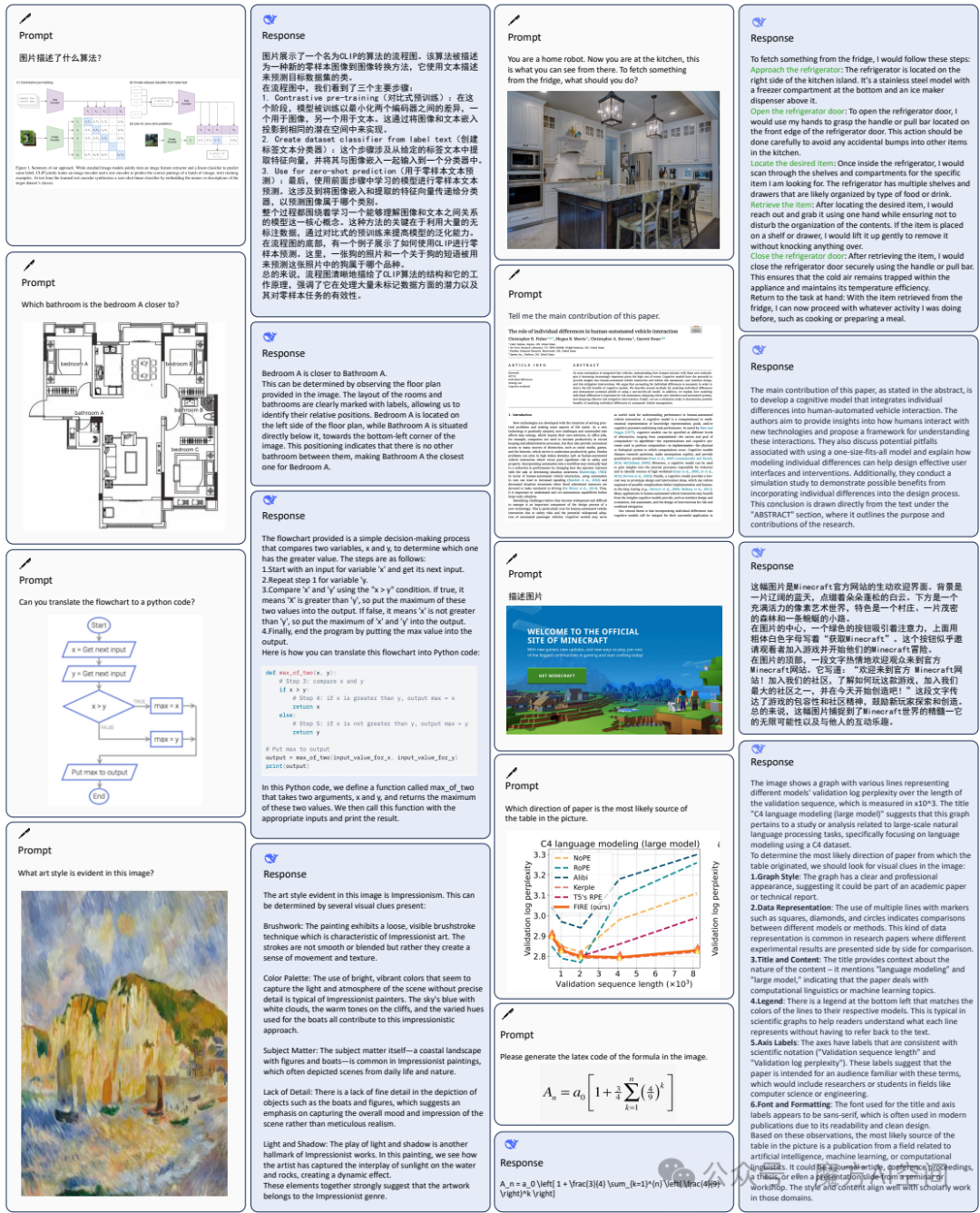 数据构建:数据集分为视觉语言预训练数据和视觉语言监督微调数据。预训练数据来自多个公共数据源,包括MMC4、Wiki、wikihow、Ebook教科书、Capsfusion、TaiSu和Detailed Caption等。微调数据则包括ShareGPT4V、LAION-GPTV、LVIS-Instruct4V等开源数据集,以及部分表格和图表数据。
