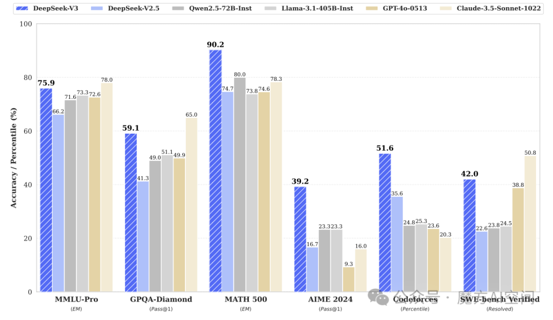 DeepSeek-V3 多项评测成绩超越了 Qwen2.5-72B 和 Llama-3.1-405B 等其他开源模型,并在性能上和世界顶尖的闭源模型 GPT-4o 以及 Claude-3.5-Sonnet 不分伯仲。