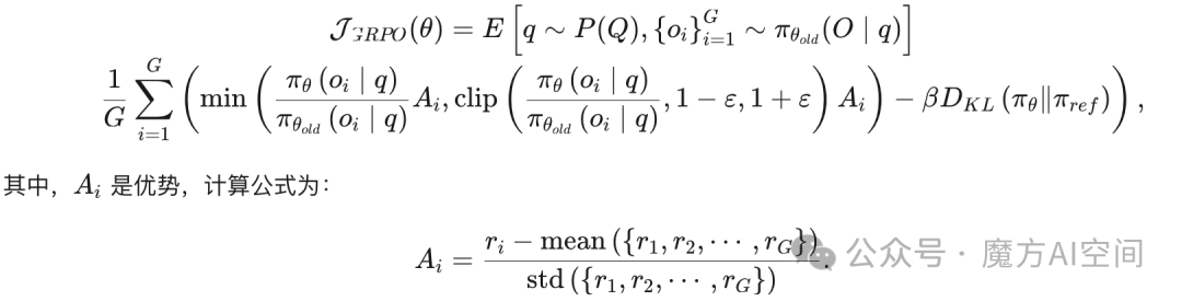 DeepSeek-R1-Zero:该模型直接对基础模型进行强化学习训练,不依赖任何监督微调数据。采用Group Relative Policy Optimization(GRPO)算法进行优化,公式如下: