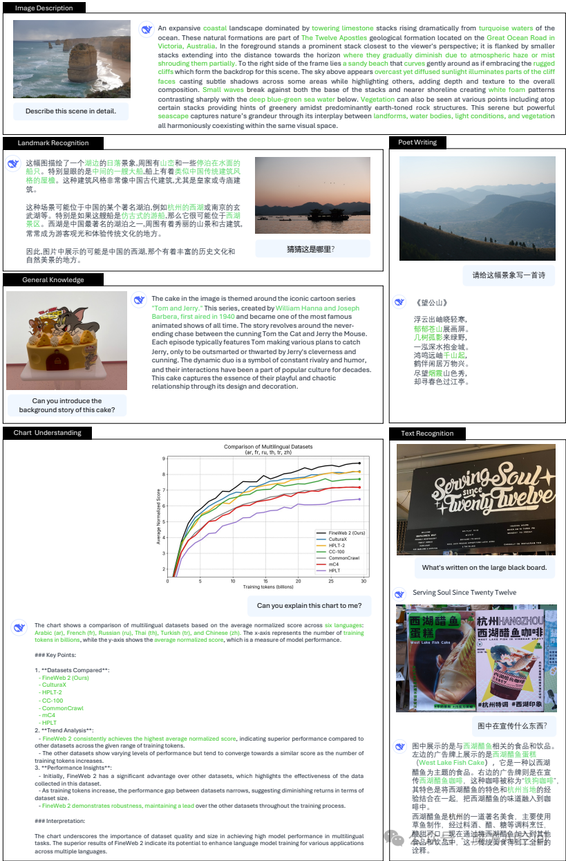 图4 | DeepSeek-VL2的一般问题回答能力。模型具备多方面的能力,包括识别地标、基于图像的诗歌创作、回答一般知识类问题、理解图表、识别文本等。