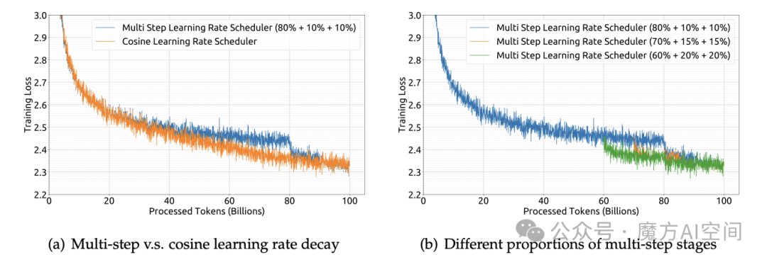 图1 | 使用不同学习率调度器或不同参数设置的学习率调度器的训练损失曲线。该模型大小为16亿参数,在包含1000亿个token的数据集上进行训练。