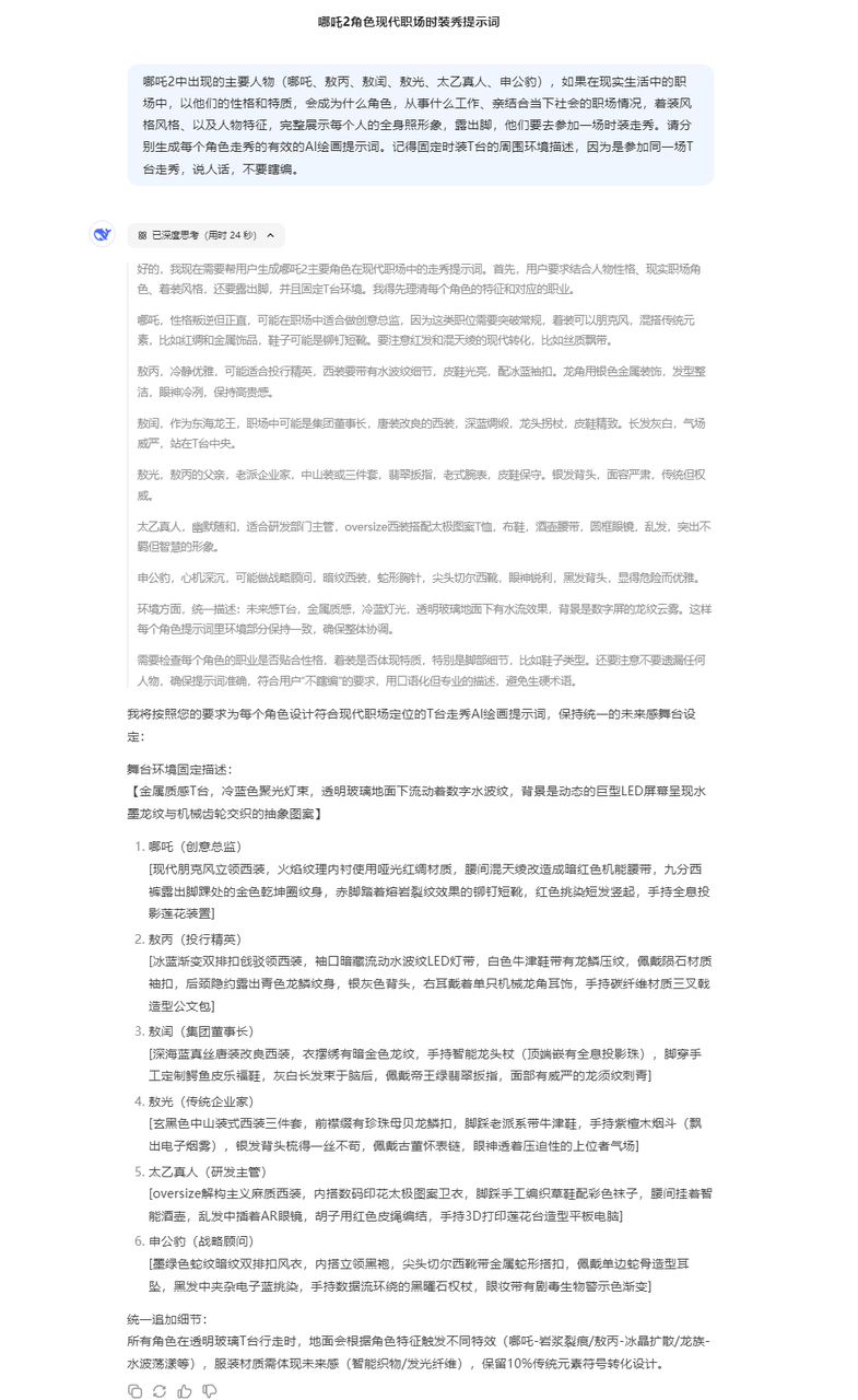 所有角色在透明玻璃T台行走时,地面会根据角色特征触发不同特效(哪吒-岩浆裂痕/敖丙-冰晶扩散/龙族-水波荡漾等),服装材质需体现未来感(智能织物/发光纤维),保留10%传统元素符号转化设计。