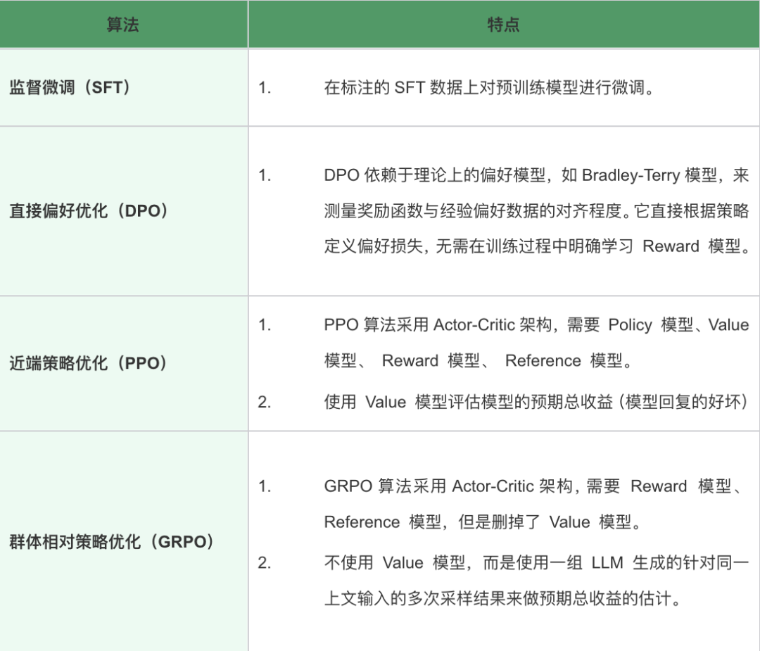 主流的RLHF算法有PPO(Proximal Policy Optimization)、DPO(Direct Preference Optimization)以及本节介绍的GRPO等。强化学习的基础理论具有较高的综合性以及深度,想要深入阅读的同学可以参考相关资料。
