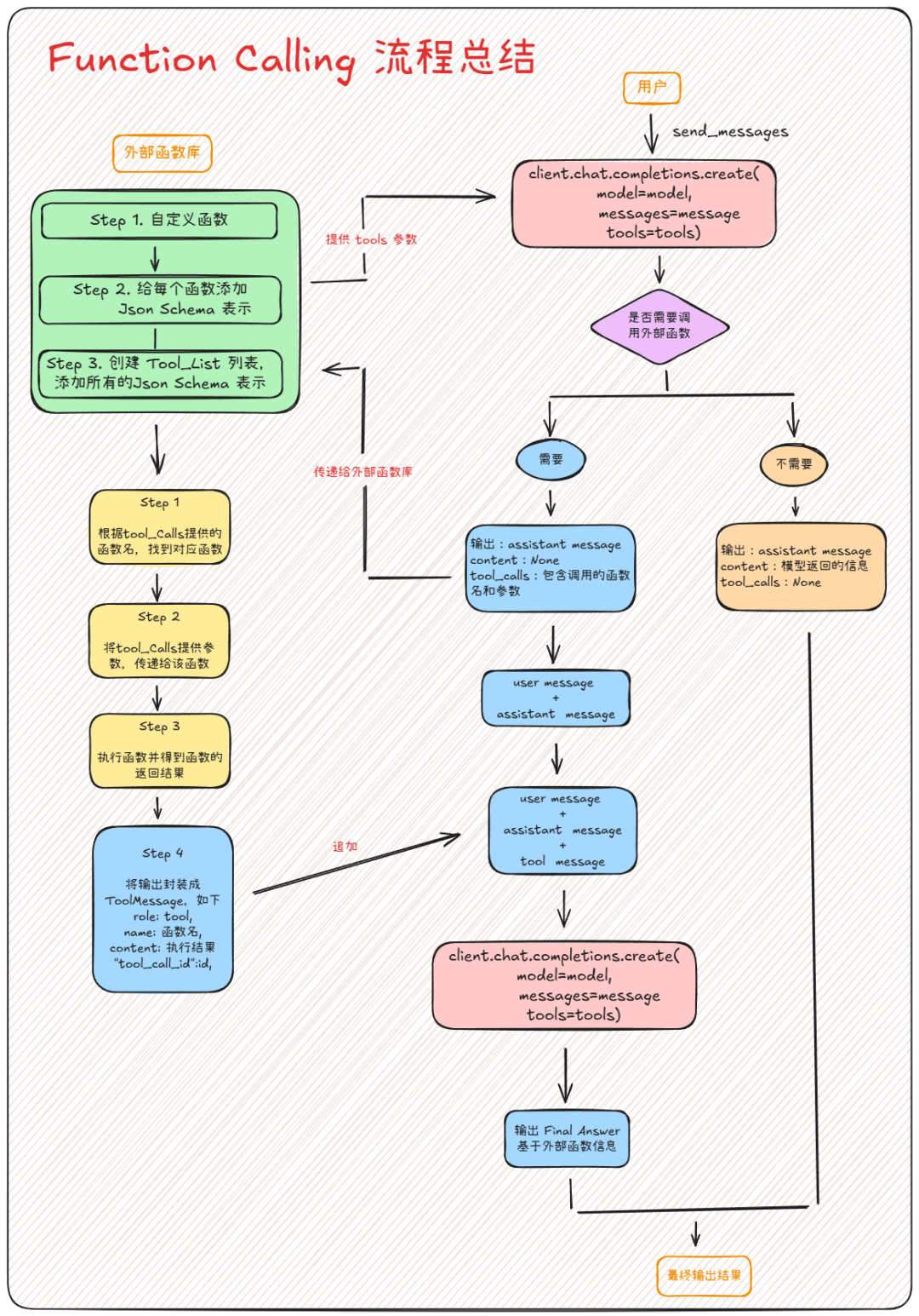 def run_conv(messages, api_key, tools=None, functions_list=None, model="deepseek-chat"): """ 能够自动执行外部函数调用的Chat对话模型 :param messages: 必要参数,输入到Chat模型的messages参数对象 :param api_key: 必要参数,调用模型的API-KEY :param tools: 可选参数,默认为None,可以设置为包含全部外部函数的列表对象 :param model: Chat模型,可选参数,默认模型为deepseek-chat :return:Chat模型输出结果 """ user_messages = messages client = OpenAI(api_key=api_key, base_url="https://api.deepseek.com") # 如果没有外部函数库,则执行普通的对话任务 if tools == None: response = client.chat.completions.create( model=model, messages=user_messages ) final_response = response.choices[0].message.content # 若存在外部函数库,则需要灵活选取外部函数并进行回答 else: # 创建外部函数库字典 available_functions = {func.__name__: func for func in functions_list} # 创建包含用户问题的message messages = user_messages # first response response = client.chat.completions.create( model=model, messages=user_messages, tools=tools, ) response_message = response.choices[0].message # 获取函数名 function_name = response_message.tool_calls[0].function.name # 获取函数对象 fuction_to_call = available_functions[function_name] # 获取函数参数 function_args = json.loads(response_message.tool_calls[0].function.arguments) # 将函数参数输入到函数中,获取函数计算结果 function_response = fuction_to_call(**function_args) # messages中拼接first response消息 user_messages.append(response_message.model_dump()) # messages中拼接外部函数输出结果 user_messages.append( { "role": "tool", "content": function_response, "tool_call_id":response_message.tool_calls[0].id } ) # 第二次调用模型 second_response = client.chat.completions.create( model=model, messages=user_messages) # 获取最终结果 final_response = second_response.choices[0].message.content return display(Markdown(f"Assistant: {final_response}"))