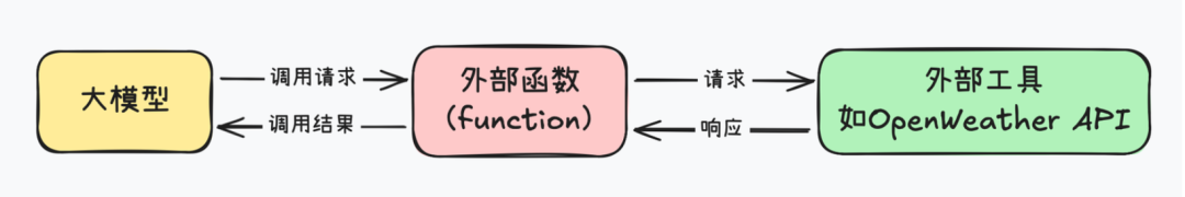 例如,当我们要查询当前天气时,让大模型调用外部工具的function calling的过程就如图所示: