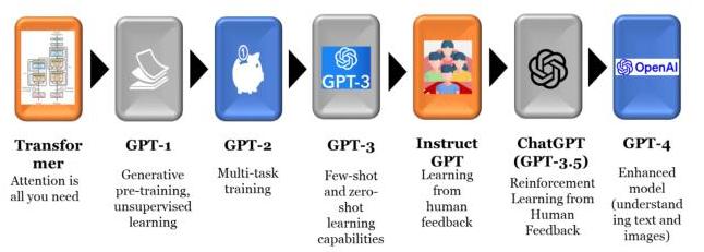 在不进行梯度更新或微调的情况下使用,基于任务和仅用文本交互指定的一小部分演示。GPT-3是一个少量样本和多任务模型,训练了8个不同大小的模型,其可训练参数范围在1.25亿到1750亿之间。GPT-3比以前的版本先进10倍,具有广泛的应用,如语言翻译、内容创作、文本分类、情感提取、创意写作、写作辅助、研究和分析、代码生成、业务指南等。GPT-3.5只是GPT-3的一个微调和迭代版本,于2022年推出。它能够生成比以前版本更逼真、相关和连贯的文本。GPT-3和GPT-3.5的参数显著增加,代表了对早期版本的重大改进。OpenAI于2023年推出了ChatGPT,其基础模型是GPT-3.5。GPT-3.5能够生成被称为人性化AI的类似人类的文本,展示出对文本语义和上下文的更深理解,从而在技术和报告写作方面表现更好。