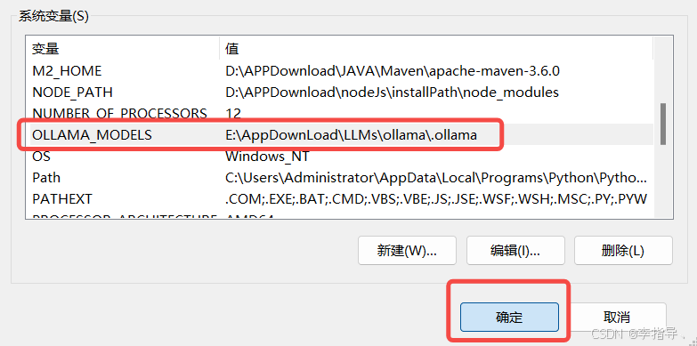 变量值:E:\AppDownLoad\LLMs\ollama\.ollama (自定义大模型存放路径)