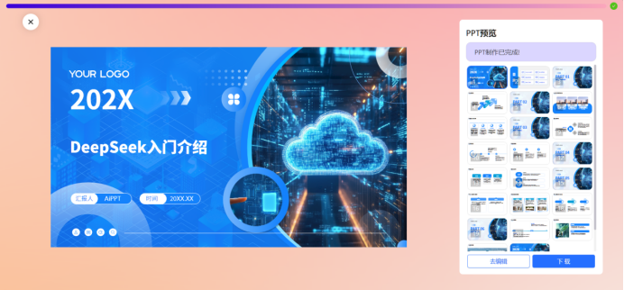 Deepseek(输入PPT主题生成PPT框架) +AI PPT(粘贴框架一键完成PPT制作)=一键生成观点清晰、美观大方的PPT。