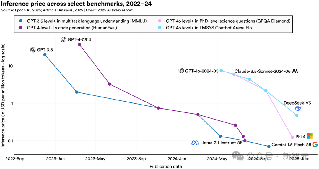在MMLU基准测试中达到GPT-3.5水平(MMLU准确率64.8%)的AI模型调用成本,已从2022年11月的20美元/每百万token,骤降至2024年10月的0.07美元/每百万token(谷歌DeepMind的Gemini-1.5-Flash-8B模型),18个月内AI成本下降280倍。