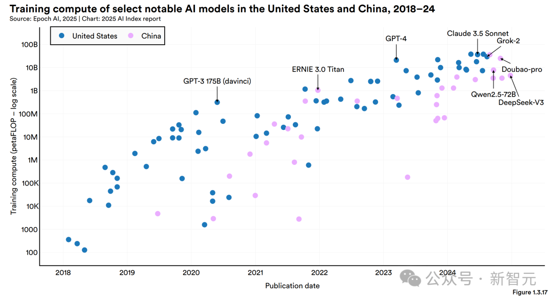 下图1.3.17比较了中国和美国知名AI模型的训练算力,揭示了一个重要趋势:美国的顶级AI模型通常比中国模型需要多得多的计算资源。