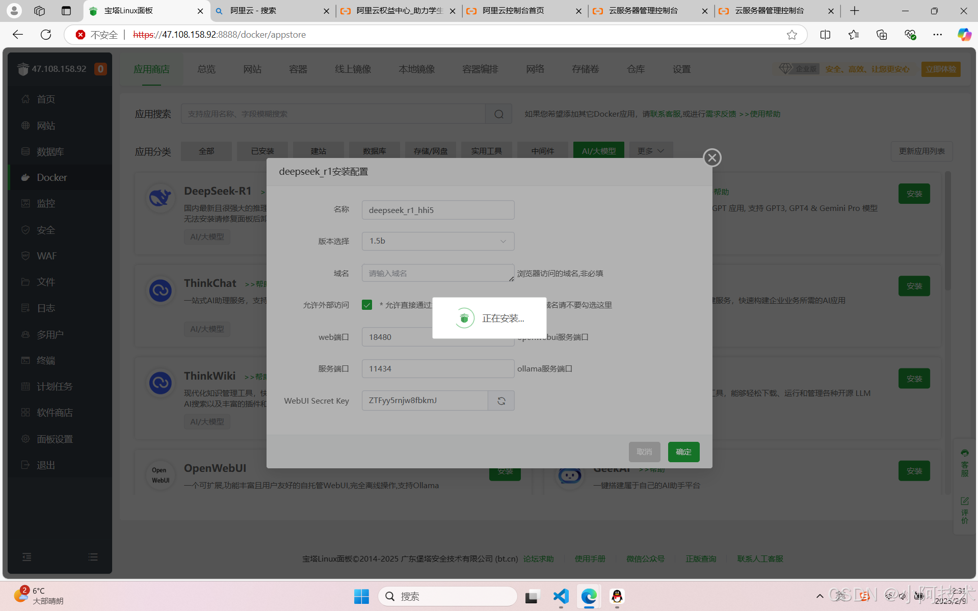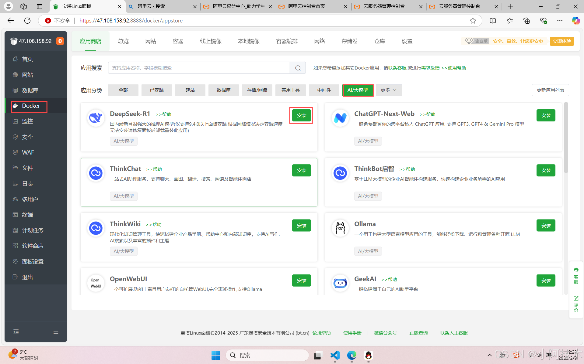 1.打开宝塔面板安装docker。2.安装deepseek。