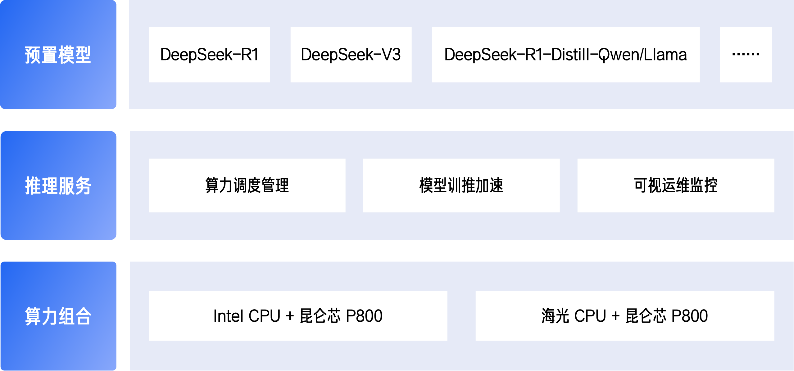 百度百舸 DeepSeek 一体机基于百度百舸平台打造,提供纯国产的算力组合,支持昆仑芯 P800 单机 8 卡部署满血版 DeepSeek R1/V3,支持 8bit 推理。企业可以将一体机部署在私有云环境中,从开箱上电到服务上线最快仅需半天。