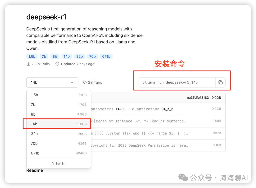 点击链接进入,可以根据自己电脑的配置,选择合适的模型参数尺寸。此处选择 14b 的模型进行演示。下拉框筛选后,复制右侧的安装命令。
