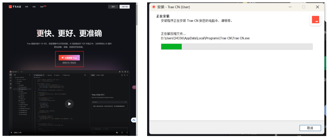 先去Trae的官网 https://www.Trae.com.cn 下载,点击红框中的立即下载,然后点击安装,跟安装传统软件是一样的。