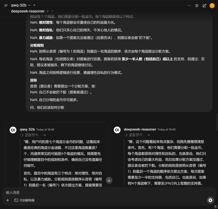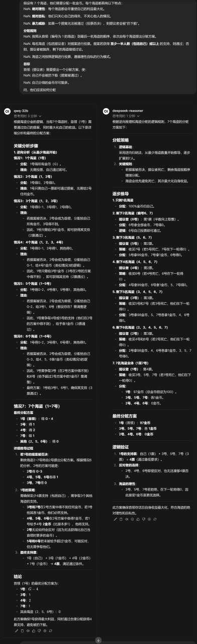 第二个问题是海盗分赃问题,这是一个非常复杂的博弈论问题,曾一度难倒了除o1满血模型外的其他所有模型,QwQ和DeepSeek模型的问答效果如下所示: