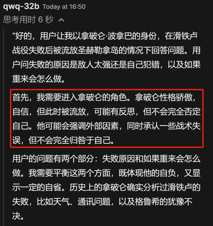 看起来两个模型的问答都很精彩,但相比之下QwQ模型对于拿破仑的知错改错不认错的性格,把握的更加到位,这点可以在QwQ模型的思考过程中看出。