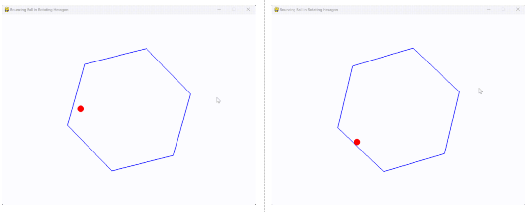 接下来第一个问题是经典的小球滚动的编程任务,要求编写一个Python脚本,模拟一个小球在旋转的六边形框体内部的运动过程,两个模型推理过程如图所示
