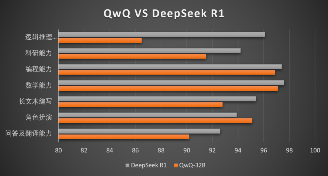 在经过了几十个小时、几千道题的测试后,最终,QwQ对比DeepSeek R1模型的各项能力评分如图所示: