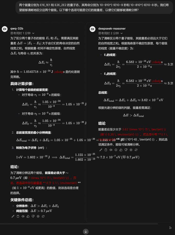 两个模型推理过程的都是对的,但QwQ的结论错误,而DeepSeek R1过程和结果都正确。