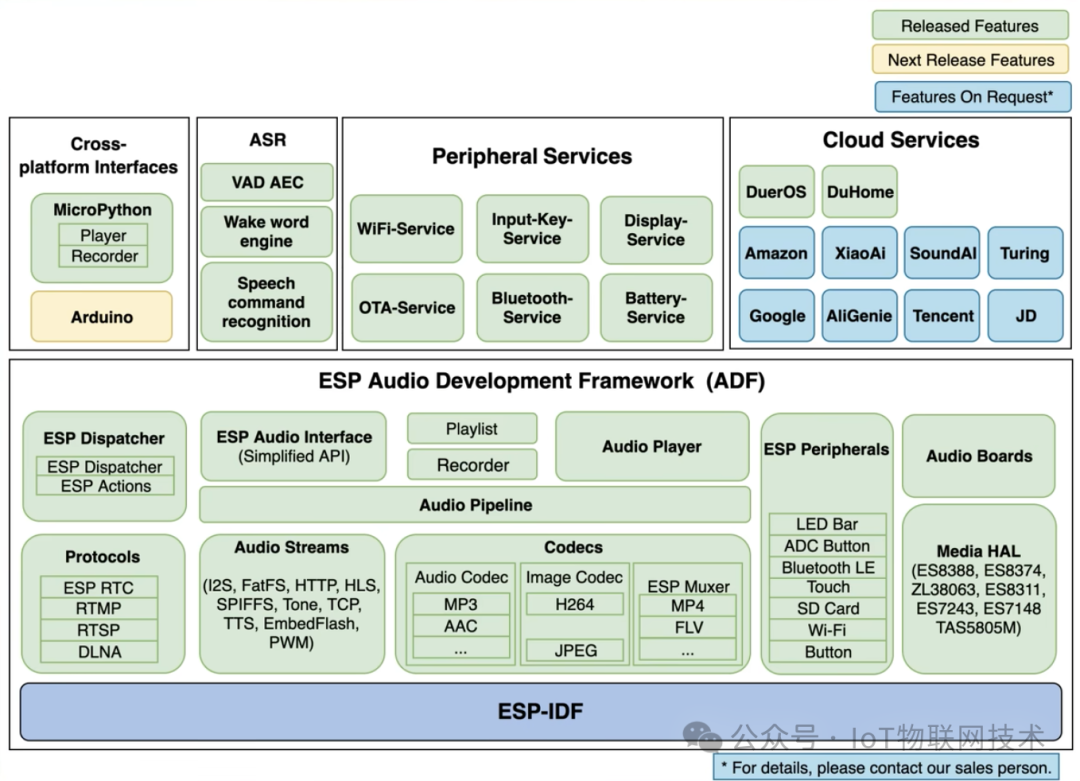 乐鑫 ESP-ADF 框架是专为音频应用设计的开发框架,基于其物联网开发框架ESP-IDF构建。它针对音频设备的开发需求,提供了丰富的音频组件,像音频编解码、CODEC 芯片驱动等,还能运行优化过的 3A 音频算法,无需额外 DSP 芯片,有效降低成本,从硬件驱动到上层应用的完整工具链和组件库,简化了音频产品的开发流程。