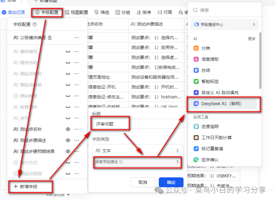 点击字段配置-新增字段,输入字段标题和选择字段类型为DeepSeek R1(联网)