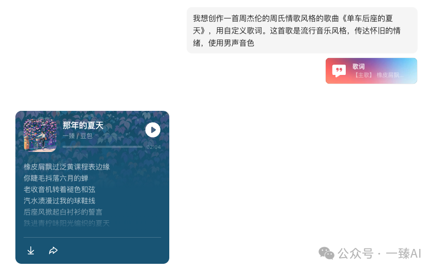 生成完成后试听作品,满意则下载保存,还可以通过豆包分享功能发送给朋友或发布到社交媒体!
